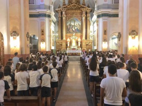 Ahir, vam inaugurar oficialment el curs amb l’Eucaristia que vam celebrar tots junts a la Parròquia. Nervis, rialles, algun que altre crit i fins i tot algun xiulit, ens han acompanyat en la celebració….però estavem contents perquè com bé diu el lema Pastoral d’enguany “Vosaltres sou els meus amics”, Jesús estava allí per a rebre'ns , Jesús estava allí per a comprendre i disculpar les nostres imperfeccions, Jesús estava allí per oferir-nos una vegada més, la seua AMISTAT. Mossén Vicent ens ha recordat que Déu és AMOR però un Amor que es manifesta en les bones obres així que pensem que tots tenim una gran tasca per davant i que necessitem també de les famílies per a fer visible eixe AMOR. Tot seguit hem desplegat al pati en presència de tots els alumnes i professors, la pancarta amb el Lema. Hem reflexionat sobre els símbols que apareixen en ella i ens hem compromés a gaudir plenament de l’AMISTAT QUE JESÚS ENS OFEREIX. A l'enllaç de la imatge teniu els millors moments.