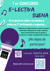 Els alumnes de Tecnologia de 4t ESO organitzen el 1er concurs “E-LECTIVA SONA" en el qual alumnes des de 3r de Primària fins a 4t ESO poden demostrar els seus dots com a narradors, cantants o músics presentant les seues maquetes en les diferents modalitats del concurs. Si t'agrada la ràdio o la música i vols demostrar les teues habilitats en aquest camp no deixes de participar en aquest esdeveniment. Les bases del concurs les pots consultar en el codi QR que es troba en els cartells de l'esdeveniment i en l'enllaç de la ràdio en la web del col·legi. Vinga, anima't i deixa escapar el teu talent!