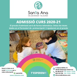 Som conscients de què alguns esteu patint pel procés d’admissió dels vostres fills. L’objectiu de la següent circular és donar-vos informació més detallada i intentar tranquil·litzar-vos, vos anirem informant i ajudant en tot el procés. Recordeu que teniu tota la informació disponible al web (https://www.cdstana.com/2019-2020/admissió-2020-2021/). De moment, amb el formulari de preinscripció, hem recollit les vostres dades per a donar-vos d’alta en el grup de Whatsapp i estem resolent els problemes de comunicació. Per a poder rebre tots els missatges heu de gravar el telèfon del Whatsapp del col·legi al vostre mòbil Tf: 644 31 87 05 . En aquests enllaç podeu consultar la circular: https://www.cdstana.com/2019-2020/circulars-2019-2020/